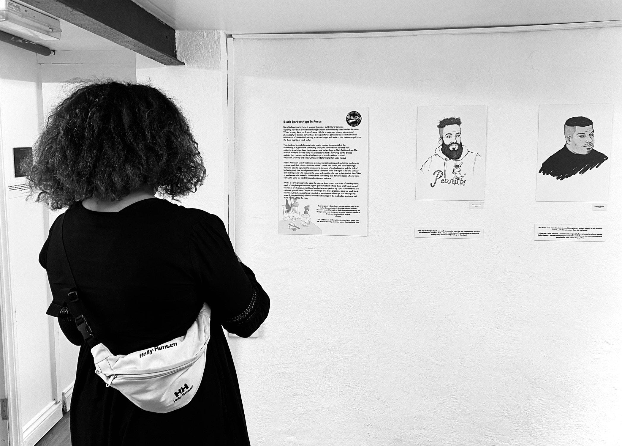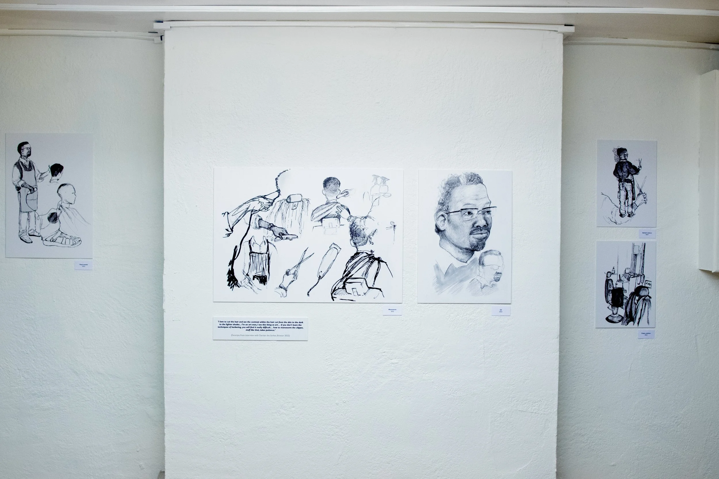 Black Barbershops in Focus is a research project by Dr Karis Campion exploring how black-owned barbershops function as community assets in their localities. With a primary focus on Brixton/Herne Hill, the project uses ethnography, art and photography to capture barbershops through different perspectives. The 2023 exhibition was a culmination of the research, writing, artworks, images and artifacts that had emerged from the three strands of work.