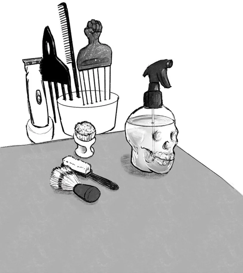 Habiba Nabisubi’s use of traditional (pencil, watercolour, ink pens) and digital mediums to explore hands, hair, clippers, scissors, barber’s chairs, afro combs, and other seemingly mundane objects, captures the atmospheric elements of the barbershop and the skill of barbering itself. Her use of portraiture has a different focus and urges us to take a closer look at the people who frequent the space and consider the role it plays in their lives. Taken as a collection, the artworks showcase the barbershop as a domestic space, a home from home, and a site for mindfulness, relaxation and intimacy.